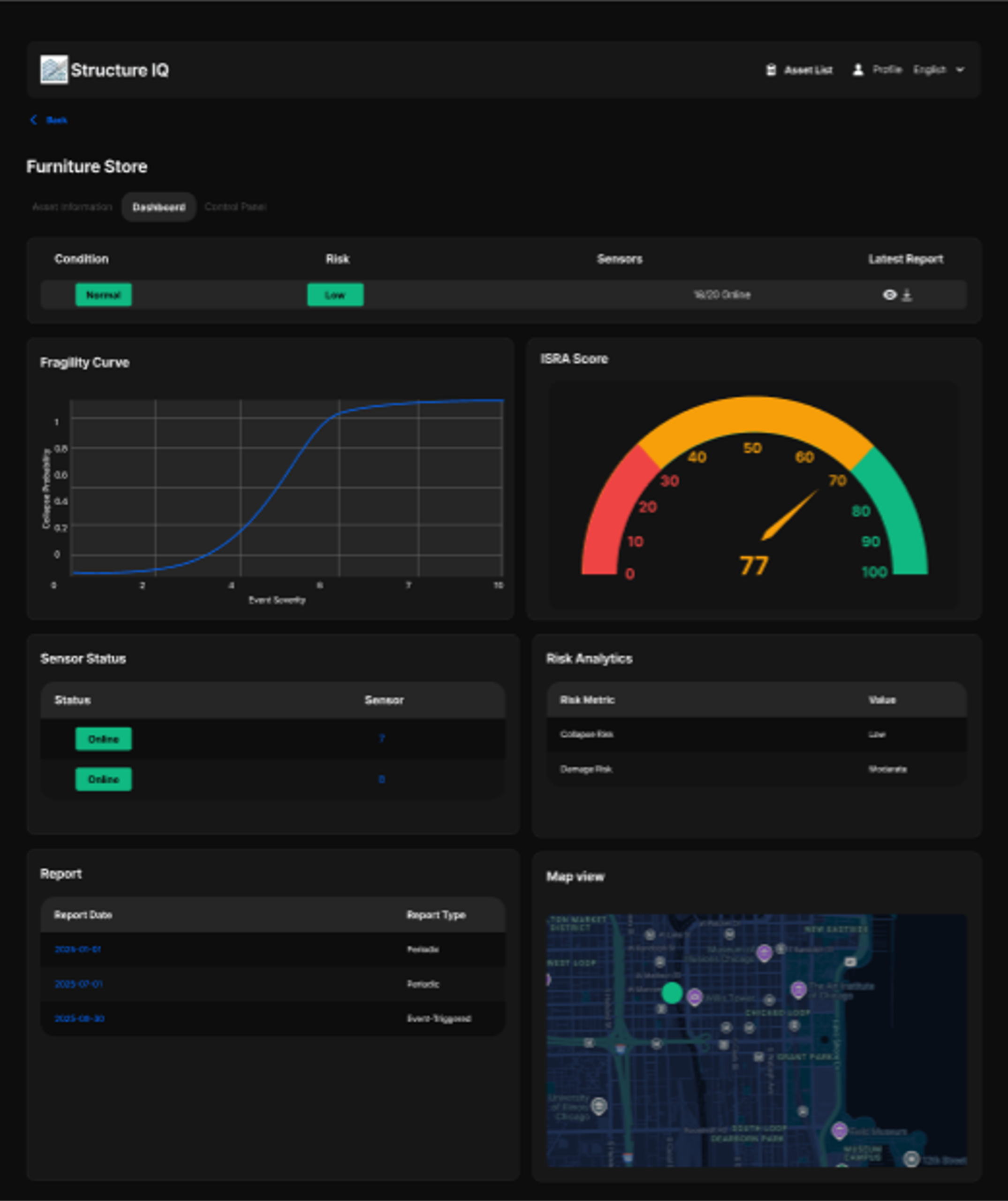 StructureIQ’s Structural Health Monitoring (SHM) technology fills a crucial information gap by providing insurance underwriters with continuous, objective, building-specific data on structural performance, by deploying wireless sensors that monitor vibration, movement, tilt, and other structural indicators, and delivering that data in a format that serves the insurance industry’s needs.